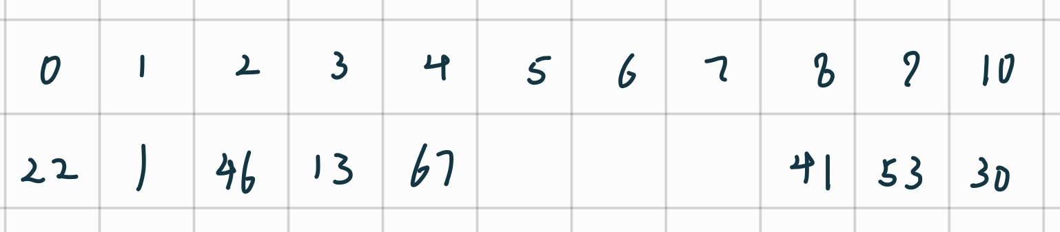 构造哈希表:22%11 = 0 , 41%11 = 8, 53%11 = 9, 46%11 = 2, 30%11 = 8, 13%11 = 2, 1%11 = 1, 67%11 = 1.