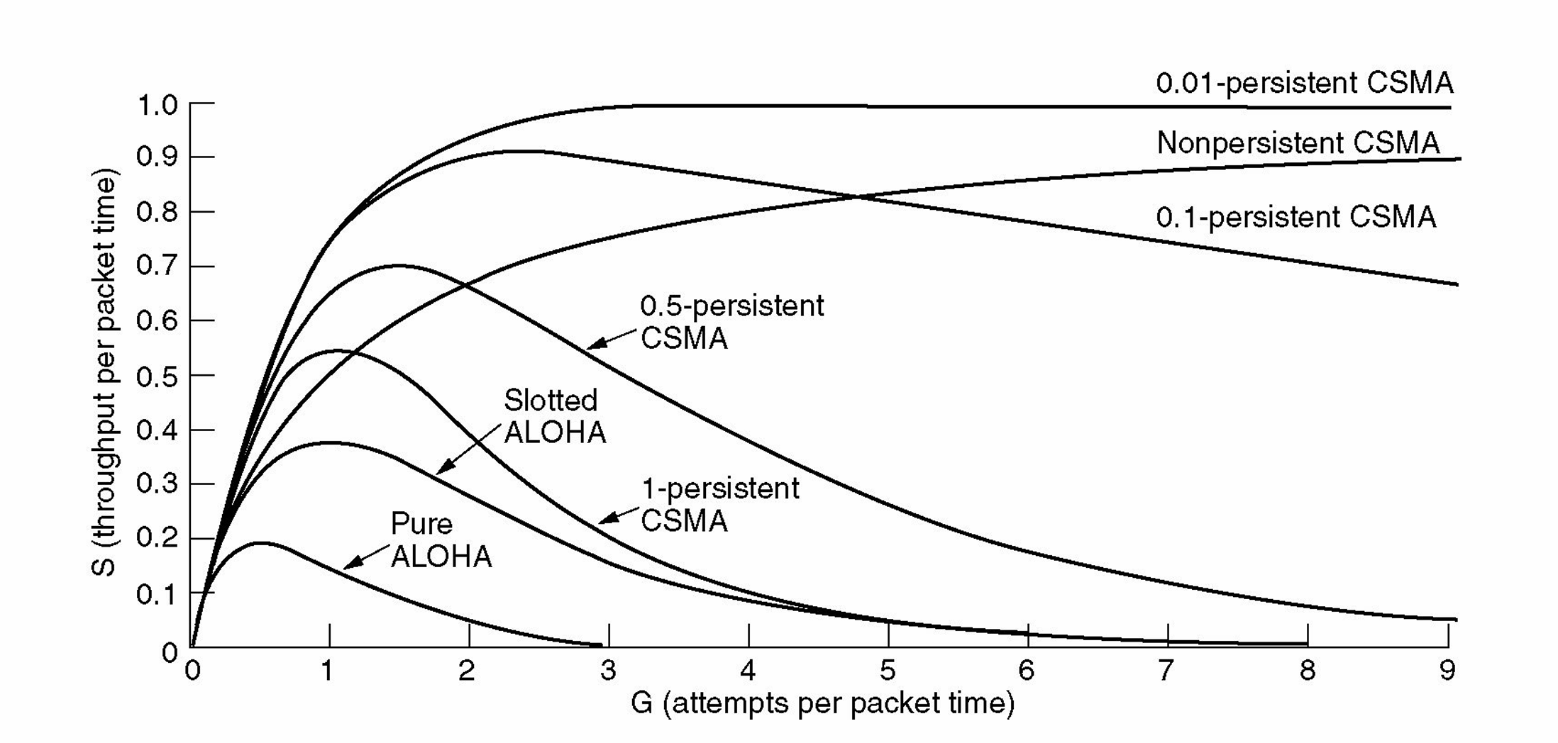 - 网络负载(Network load G):是每帧时内的平均帧数,且G大约等于S,具体指时间T内所有Station 发送的帧的平均值