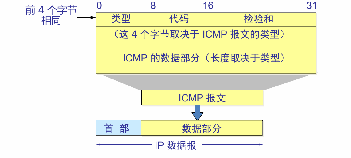 - ICMP报文的前四个字节是统一的格式
